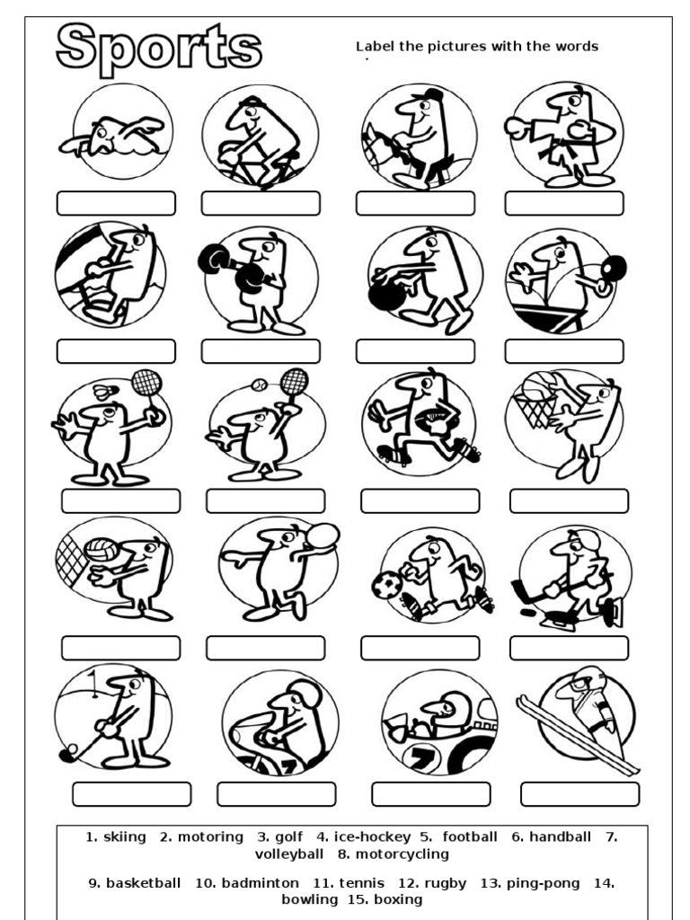 Sports: Theme Unit - Activities, Worksheets, and Lesson Plans Vocabulary Board Game. Board Game with Sports words. Sentences. Complete the sentences, fill-ins are words from Sports word list. Complete the sentences, fill-ins are words from Sports word list and also a random word. Complete the sentences: related to Sports words but some different words. Matching sentence halves.